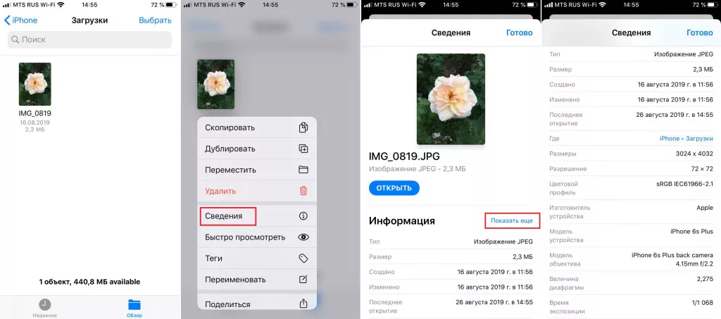 Теперь откройте приложение «Файлы» и перейдите к сохраненной фотографии. Нажмите на нее долго или сильно и выберите пункт «Сведения». После этого тапните в открывшемся окошке на текст «Показать еще» и можете изучать представленные метаданные: