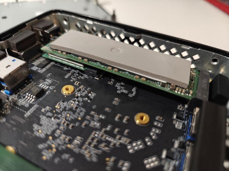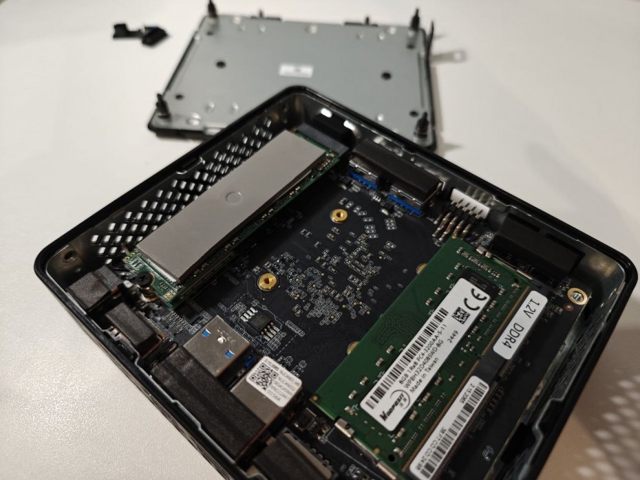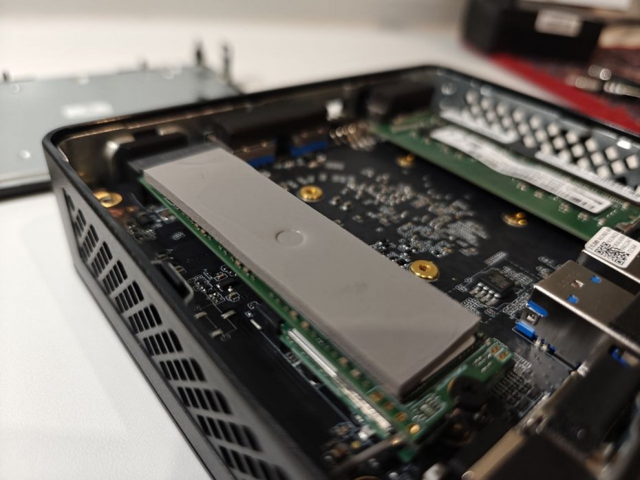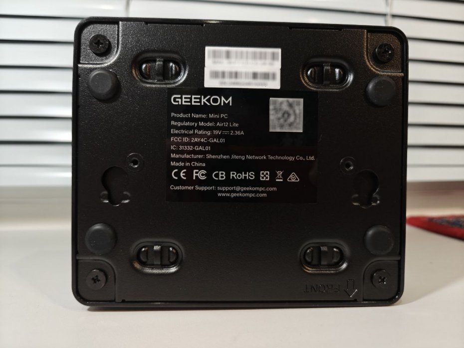 Конструктивно Air12 Lite немного отличается от других моделей Geekom — заметно, что инженеры улучшили корпус. К примеру, болты больше не скрываются за резиновыми ножками, появились вырезы, чтобы подвешивать компьютер на крепления, а дно стало двойным для более эффективного отведения тепла, в том числе от накопителя, который соприкасается с нижней крышкой с помощью термопрокладки.
