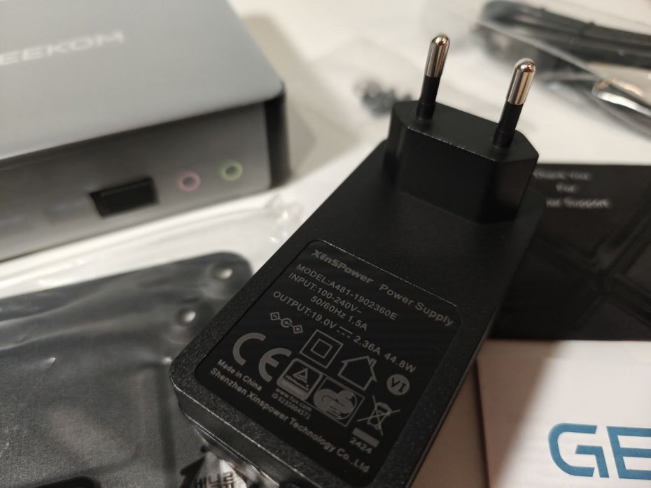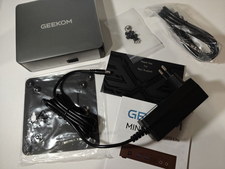 Geekom Air12 Lite поставляется в небольшой картонной коробке, в которой, помимо собственно компьютера, лежат ещё блок питания, HDMI-кабель, VESA-адаптер с болтиками, инструкция и карточка с благодарностями за покупку. Могли бы положить небольшую крестовую отвёртку на случай апгрейда, но она наверняка найдётся в каждом доме.
