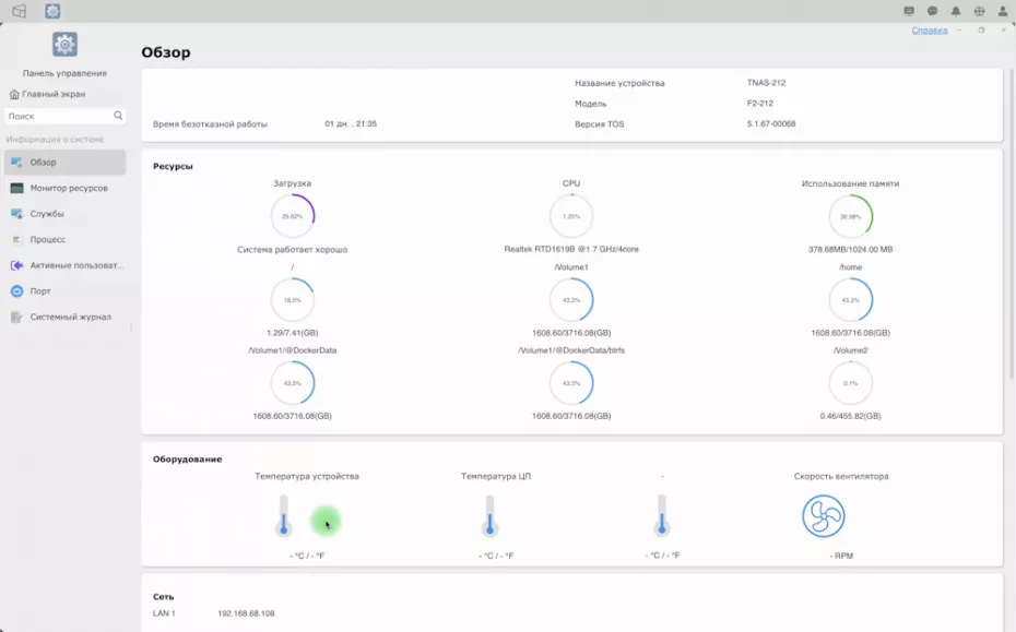 Не стоит думать, что это просто примитивный кейс для подключения винчестеров к компьютеру, вовсе нет. За работу F2-212 отвечает мощная электронная начинка: процессор Realtek RTD 1619B с четырьмя ядрами ARM V8.2 Cortex-A55, 1 ГБ оперативной памяти и видеоускоритель, которые вместе с фирменной операционной системой TerraMaster OS (она же TOS) выполняют множество задач: распределение файлов по RAID-массиву, шифрование, облачный доступ, аппаратное кодирование и декодирование видео, функционирование различных приложений, в том числе мультимедийных.