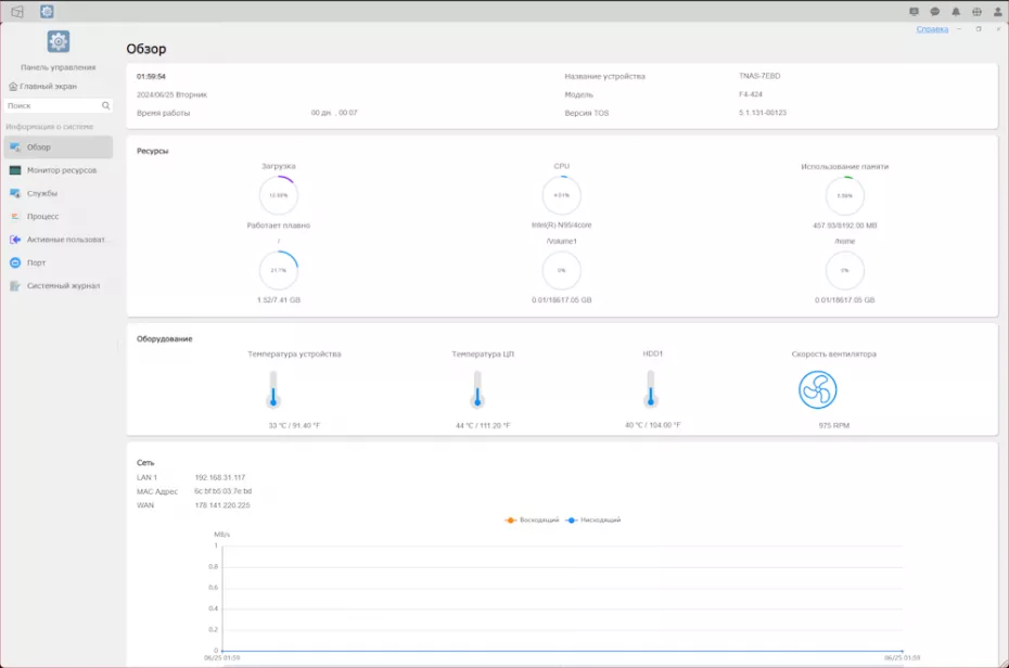Процесс подключения и настройки F4-424 предельно прост. Необходимо соединить NAS с роутером или компьютером через LAN-кабель и открыть в браузере сайт start.terra-master.com. Альтернативно можно использовать утилиту TNAS PC с сайта производителя. При первичной настройке данные на дисках будут удалены, а процесс синхронизации может занять несколько часов в зависимости от объема.