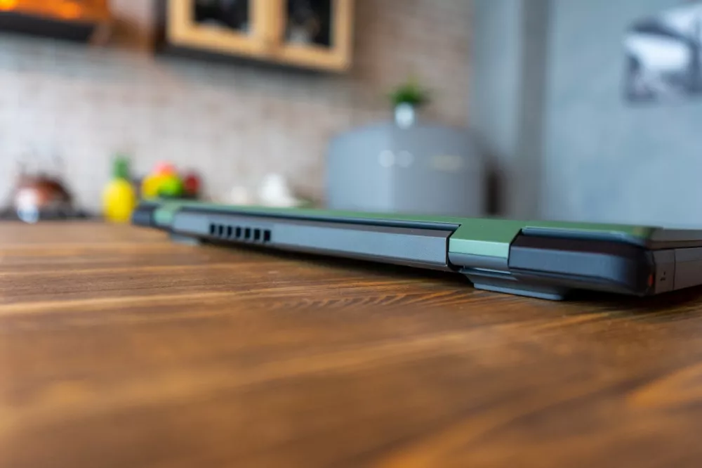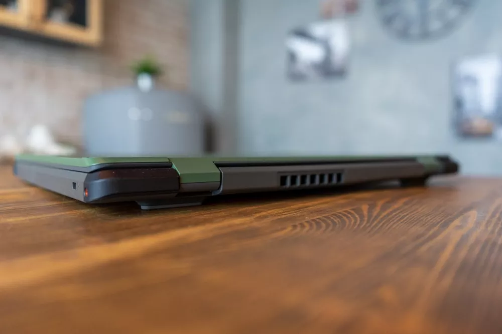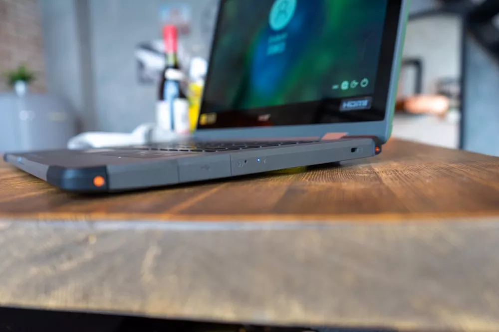 Углы Acer Enduro Urban N3 защищены прорезиненными «глушителями». Это важный элемент конструкции, который дополнительно защищает устройство при самых опасных падениях на торцы. Открывается ноутбук с небольшим усилием. У «петлей» приятный ход без люфта, он дополнительно производит впечатление надежности. На правой грани Acer Enduro N3 размещены разъемы питания, HDMI и два USB-A, USB-C, слот для карт памяти и 3,5 мм аудиоразъем, а на правой только один USB-A.