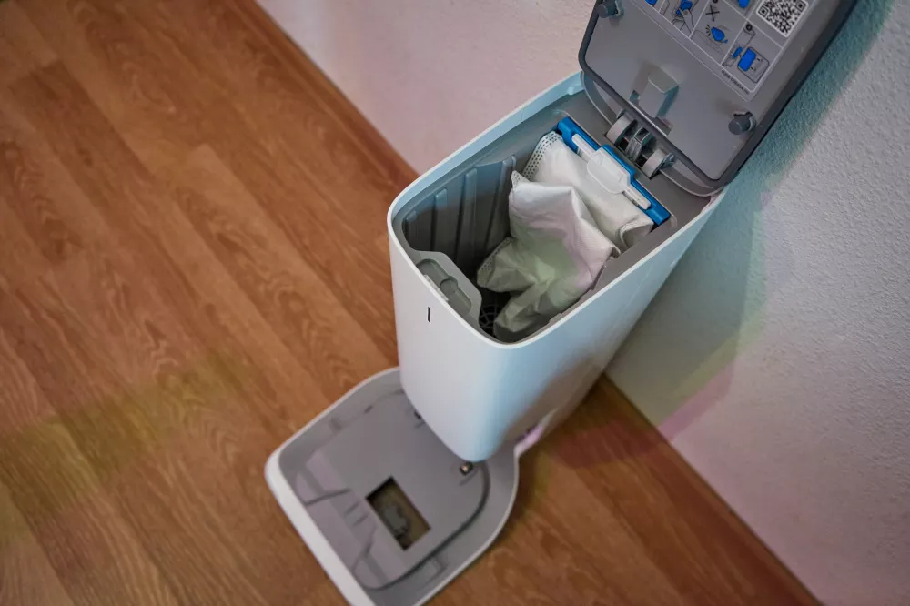Внутри располагается мешок для пыли, который извлекается с помощью пластмассового основания. Почему в конструкции системы самоочистки используется такой метод? Всё дело в том, что такие мешки позволяют максимально сократить проникновение грязи из пылесборника наружу. По словам Samsung, очищать мешок нужно около 1-3 раза в месяц в зависимости от площади квартиры или дома.