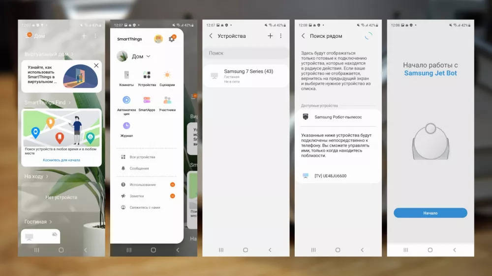 Для полноценного управления всеми функциями Samsung Jet Bot AI+ нужно установить приложение SmartThings на смартфон. Затем запустить его и перейти в раздел «Устройства» — здесь происходит активация робота-пылесоса. Во время поэтапной настройки сервис предложит выбрать место и комнату размещения, а после этого начнется привязка к Samsung-аккаунту. По завершению всех необходимых настроек Jet Bot AI+ приветствует пользователя и предлагает сделать первый запуск. Можно выбрать одну из двух опций: