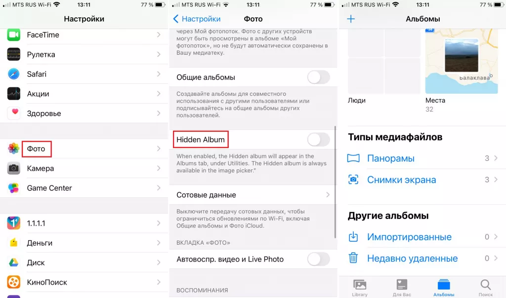 Для этого перейдите в Настройки > Фото и уберите галку с пункта «Скрытый альбом»: