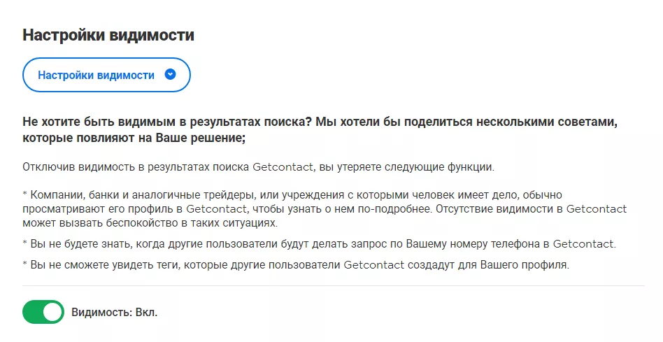 Зайдите на сайт GetContact, залогиньтесь в нём, подтвердив свой номер телефона через Telegram или WhatsApp, и перейдите в раздел «Управление конфиденциальностью профиля». Вы увидите теги, указанные другими пользователями для вашего номер, а также опцию «Настройки видимости». Отключите свою видимость в сервисе.