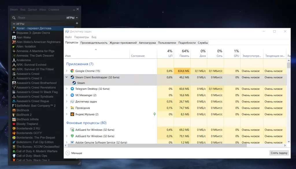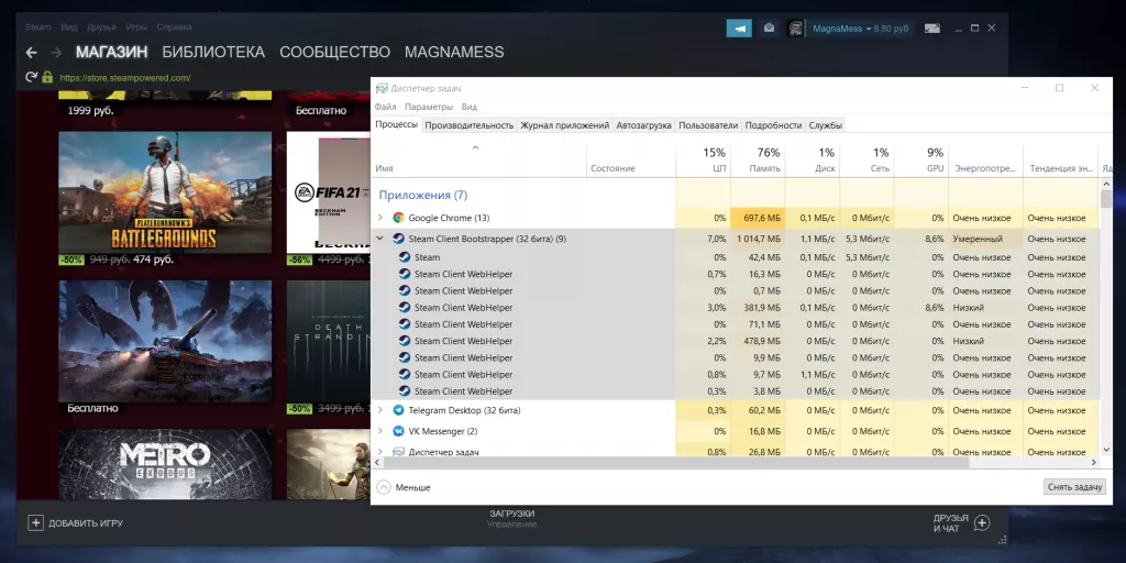 Steam, пожалуй, самая известная игровая площадка на ПК: здесь есть как магазин, так и сообщества. Здесь можно общаться и даже звонить друзьям, смотреть трансляции и многое другое. И, разумеется, все это привело к тому, что современный клиент Steam может отъедать себе до гигабайта оперативной памяти: