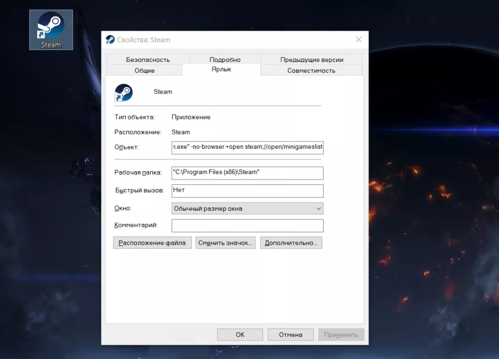 Запустить такой режим несложно: перейдите в папку с установленным Steam, найдите там файл steam.exe и создайте его ярлык. Переместите его в удобной место, после чего зайдите в его свойства и допишите в конце строки «Объект» следующий текст: -no-browser +open steam://open/minigameslist. Должно получиться так: