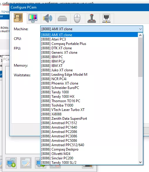 Скачайте PCeM V17 с сайта разработчиков и распакуйте архив в любую папку. Возьмите с GitHub файлы для эмуляции различных компьютеров и скопируйте их в поддиректорию roms в папке, куда вы распаковали программу.