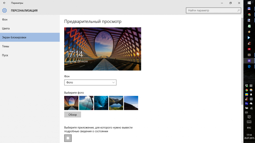 Экран блокировки — «шторка», за которой скрывается страница входа в операционную систему. В качестве фона для него можно выбрать любую фотографию, хранящуюся в памяти, а помимо даты и времени на ней может быть показана подробная информация из какого-нибудь одного приложения (например, прогноз погоды), а также краткая сводка еще из нескольких (будильник, почта, календарь и так далее). Поддержки сторонних приложений, к сожалению, нет.