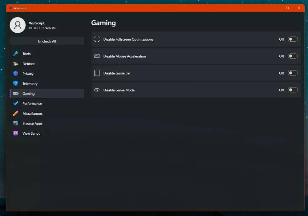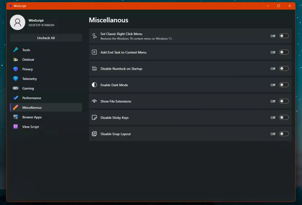 К преимуществам WinScript относится безопасность всех действий. Эта утилита не лезет глубоко в систему и не модифицирует системные файлы, а все внесённые изменения в ней же можно откатить обратно, просто убрав галочки с тех или иных опций и запустив новый скрипт.