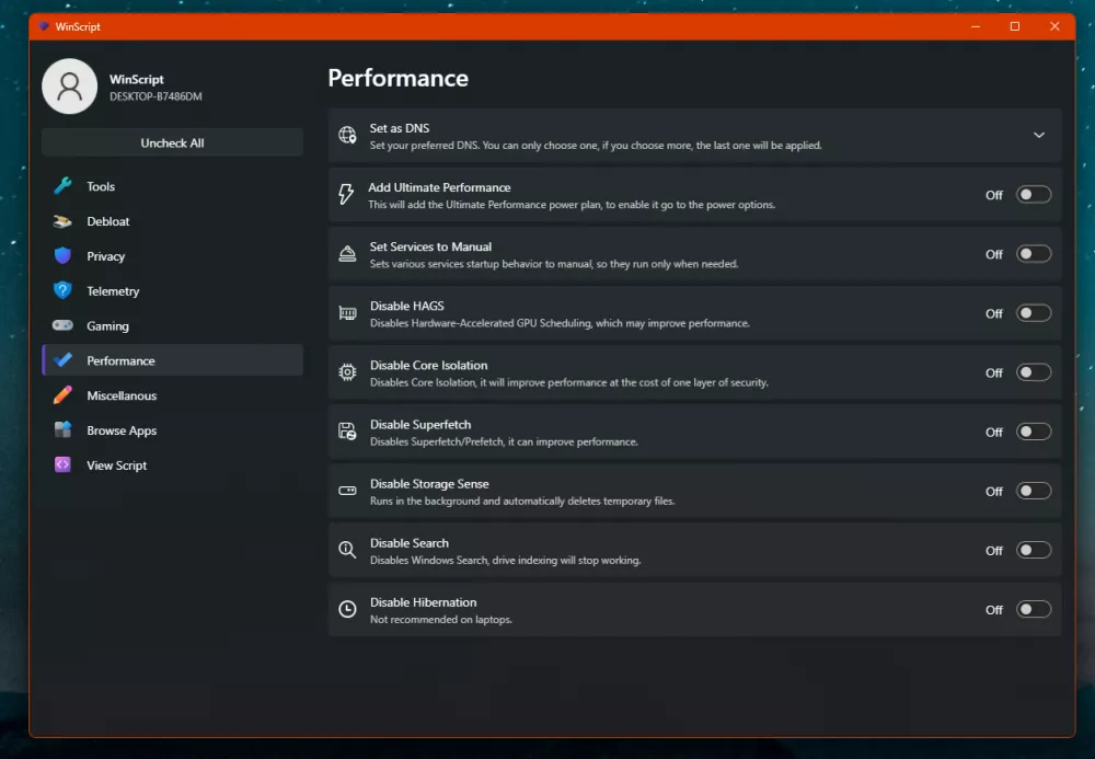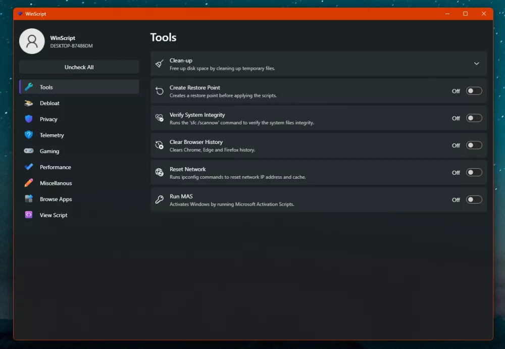WinScript позволяет запускать встроенные утилиту для очистки накопителя, создания точки восстановления, проверки целостности данных, сброса сетевых настроек и удаления браузерного кэша. Также есть опция удаления встроенных программ и отключения различных компонентов. Можно настроить параметры конфиденциальности, отключить передачу телеметрических данных на сервер Microsoft, отключить оптимизацию игр, а также «поиграть» с параметрами, отвечающими за производительность компьютера (например, отключить изоляцию ядра).