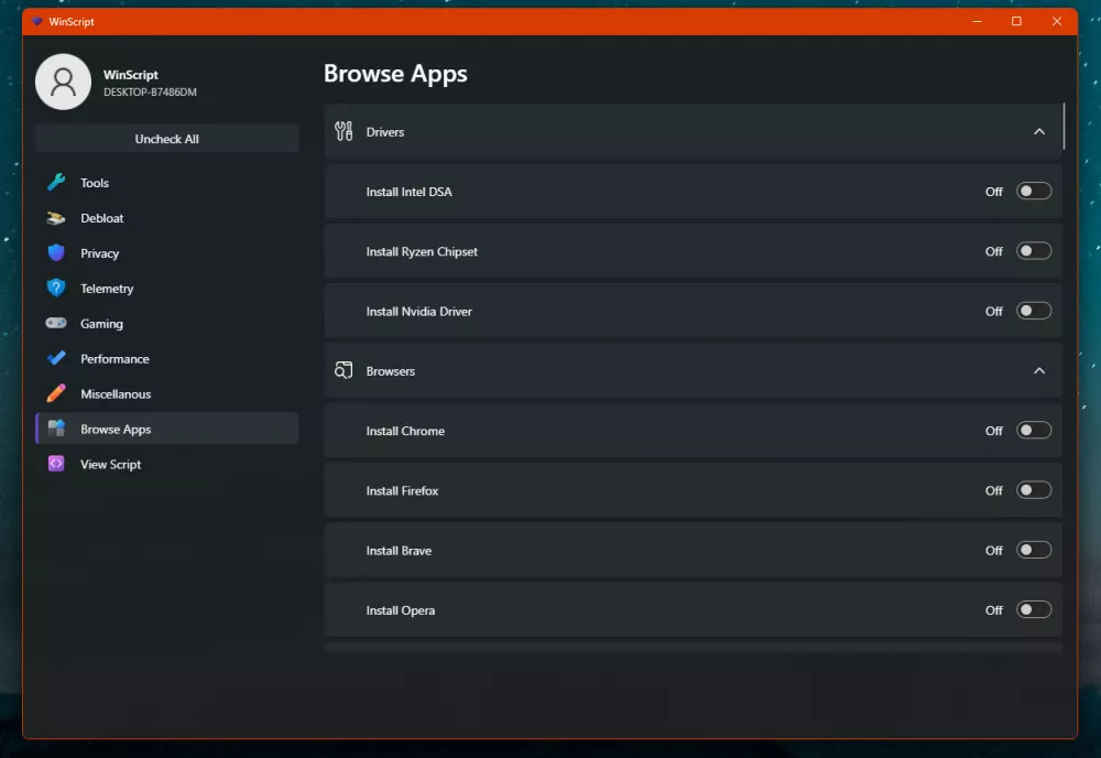 Из дополнительных возможностей WinScript — скачивание и установка популярных бесплатных программ, утилит и драйверов на все случаи жизни (браузеры, плееры, мессенджеры, графические редакторы, офисный софт, антивирусы, архиваторы, игры и многое другое). После того как вы внесли все необходимые изменения, программа создаёт bat-файл со скриптом. Его можно запустить выполняться прямо в WinScript или сохранить для переноса на другие компьютеры, которым требуется точно такая же настройка. Естественно, скрипт нужно запускать с правами администратора.