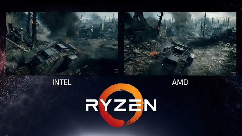 Но перейдем к более разумноему использованию потребительских процессоров - к играм(все же для рендеринга лучше подходят серверные решения). И тут ситуация с AMD опять непонятная: они протестировали i7-6900K и свой процессор в игре Battlefield 1, в 4K разрешении с видеокартой Titan Pascal X, причем выглядело это как-то так: