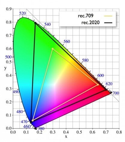 SDR формат базируется на колориметрических параметрах, описанных в Rec. ITU-R BT. 709. Они охватывают всего лишь 35,9% видимого человеческим глазом спектра системы CEI 1931 (Рис. 1). В свою очередь HDR использует цветовые параметры Rec.ITU-R BT. 2020, охватывающие 75,8% спектра.