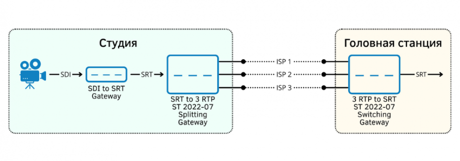 Пример: передача сигнала из студии на головную станцию через открытый интернет с использованием трех независимых провайдеров — ISP1, ISP2, ISP3. Даже при потере связи с одним из провайдеров система продолжит доставку потока без прерываний, компенсируя недостающие пакеты из других линий. Это значительно повышает отказоустойчивость трансляции, особенно при работе в нестабильных сетевых условиях.
