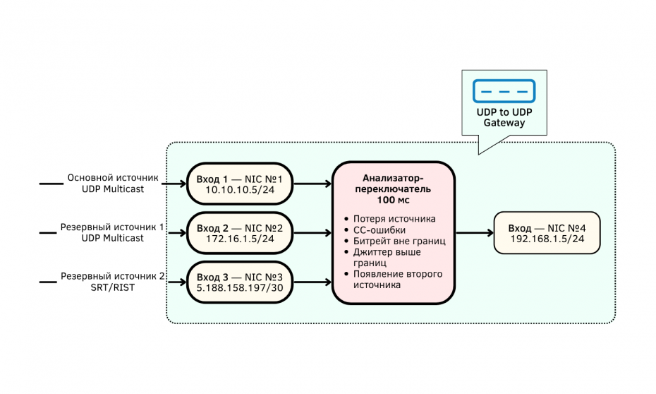 Гейтвеи также применяются внутри одной локальной сети для организации резервирования источников. Эти источники могут доставляться различными протоколами (UDP, RTP, SRT, RIST) и через разные сетевые интерфейсы. Например, можно получать основной и несколько резервных источников из разных подсетей или даже извне, а также настроить приоритет резервных источников.