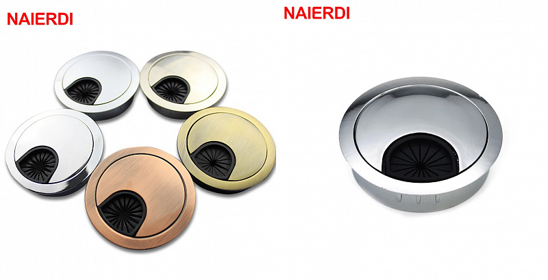 Данная заглушка пригодится, если нужно аккуратно вывести провода на столе или кухонной столешнице. У продавца есть несколько цветовых решений заглушек, а также три диаметра: 50мм, 53мм, и 60мм.