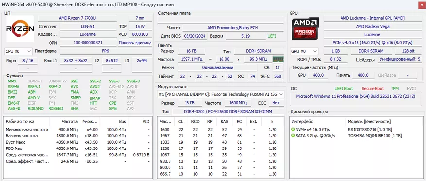 Детальная информация о накопителе показала, что он новый и общее время работы составило 3 часа (установка системы производителем + мои первоначальные тесты). Датчик температуры имеется и корректно работает. Накопитель поддерживает режим передачи PCIe 4.0 x4, но AMD Ryzen 7 5700U работает только с PCIe 3.0 x4.