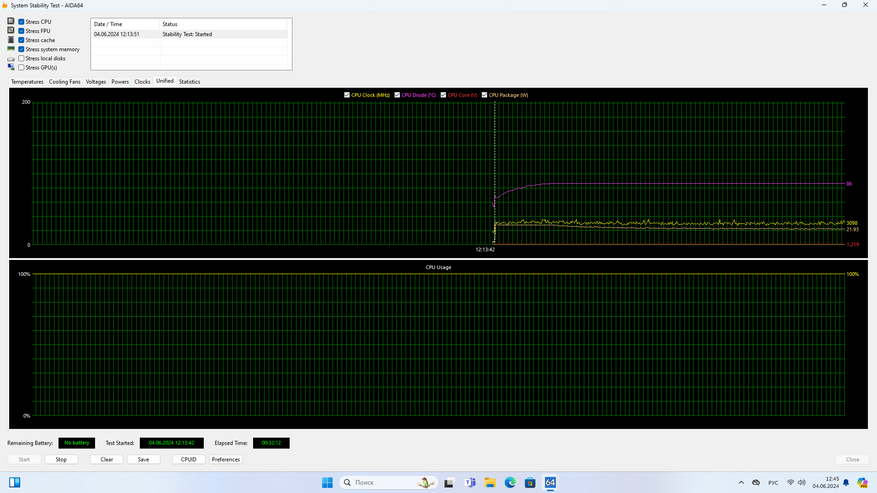 А вот собственно и результаты стресс тестов. Для начала на 30 минут запустил тест стабильности системы от Aida 64 с нагрузкой на CPU. Первое время TDP держится на уровне 27,7W, после чего снижается сначала до 24, а позже до 22W. Все это позволяет удерживать температуру на уровне 86 градусов (запас до критической температуры 14 градусов).