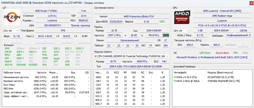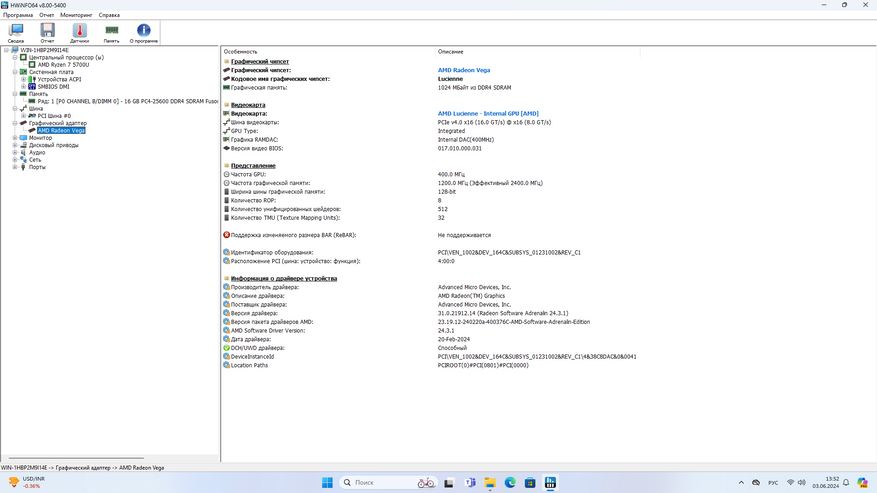 Теперь изучим аппаратные возможности. Blackview MP100 работает под управлением AMD Ryzen 7 5700U. Интегрированная графика Radeon RX Vega 7 с динамической памятью (за счет оперативки) предназначена для простых графических задач и мультимедиа.
