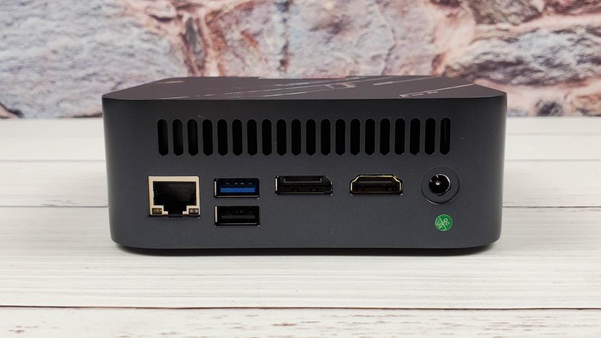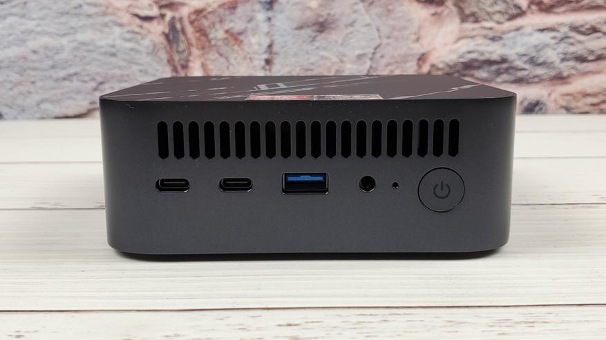 На лицевой части можно найти кнопку питания, аудио выход для наушников, а также разъемы для подключения внешних накопителей: пара USB-C и USB 3.0. Разъемы USB-C здесь полноценные с интерфейсом USB 3.2 Gen 2 и поддерживают передачу данных со скоростью 10 Gbps, а также вывод изображения в 4К\60 Hz. Кстати, компьютер умеет выводить изображение одновременно на 3 экрана: через DP, HDMI и USB-C. Причем через DP он выводит 4К с частотой обновления до 144 Hz, а через HDMI и USB-C будет 4К с частотой 60 Hz.