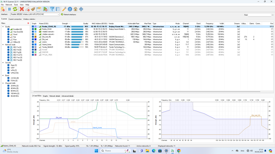 Проверим компьютер в самых распространенных сценариях использования. Но сперва протестируем WiFi модуль и LAN порт, чтобы узнать какую скорость подключения можно получить в интернете. Через сканер видим, что он поддерживает заявленный стандарт AX, т. е действительно имеет поддержку WiFi 6.