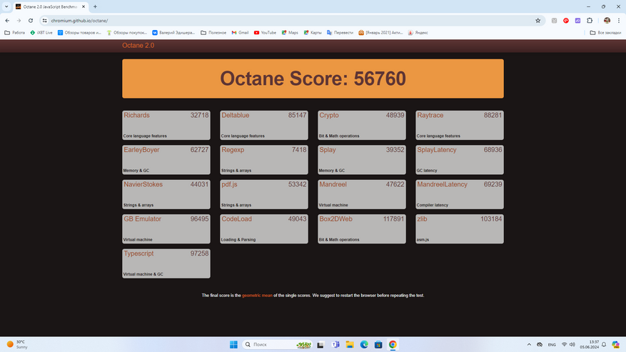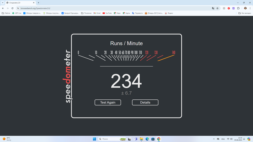 Лучше всего реальную производительность покажут тесты, вроде «Спидометра», которые тестирует производительность в браузере в реальных задачах. И во второй версии теста компьютер набирает 234 балла. Для примера могу сказать, что машинка на мощном десктопном Core i7-10700K с TDP 125W набрала в этом тесте всего 200 баллов.
