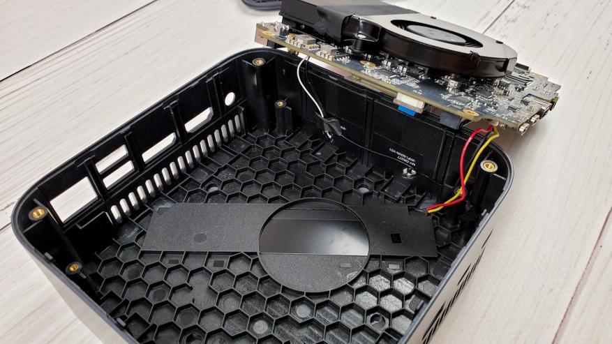 Разборка устройства идет поэтапная. Для установки дополнительного HDD или SSD формата 2,5″ достаточно просто снять верхнюю крышку. Здесь открывается SATA-разъем и ниша под накопитель. Для его охлаждения сделали решеточку в основании.