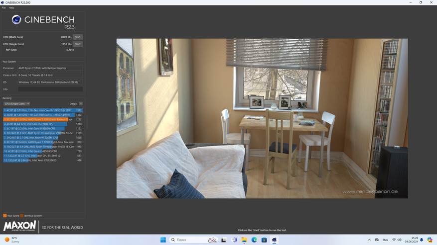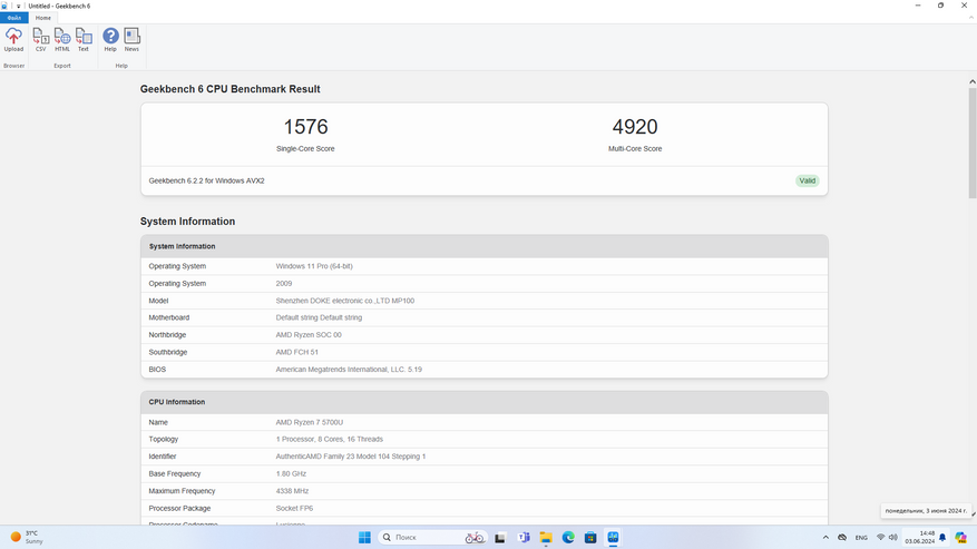 Помимо тестирования производительности в бенчмарках параллельно хочу сравнить результат с компьютером GenMachine Ren 5000 на Ryzen 5 5600H (обзор здесь), т. к тогда меня спрашивали, что лучше: Ryzen 5 5600H или Ryzen 7 5700U. Итак, в Geekbench 6 компьютер от Blackview набрал 1576 баллов в режиме одного ядра и 4920 баллов в многоядерном режиме. Компьютер на Ryzen 5 5600H набрал 1911 и 7414 баллов соответственно. Т. е 5600H мощнее, чем 5700U. Но есть нюанс…