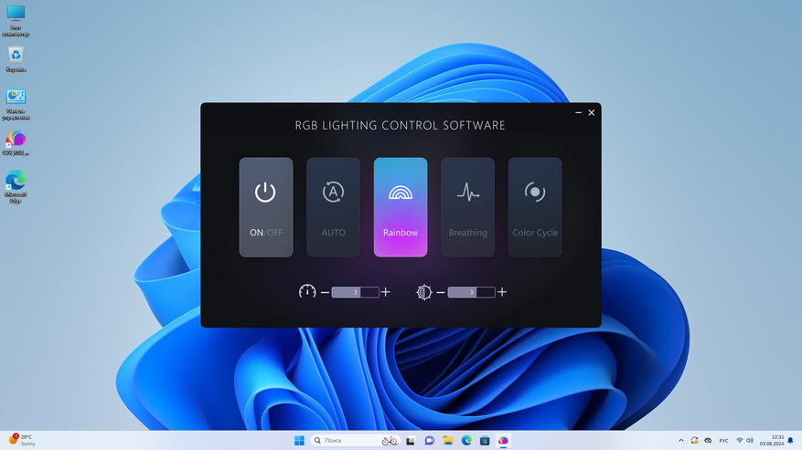 Подсветка настраивается из предустановленного приложения RGB Lighting control, здесь же ее можно полностью отключить. Есть несколько режимов: дыхание, радуга и переключение цветов. Можно настроить скорость эффектов, а также яркость.