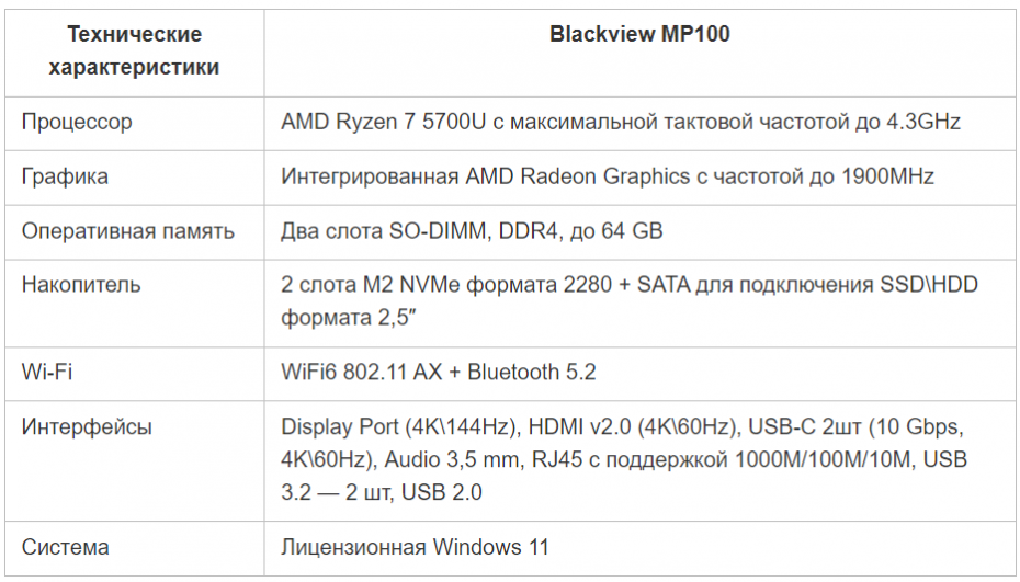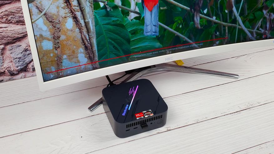 У Blackview получился интересный домашний компьютер. В описании товара они слегка перегнули палку насчет игровых возможностей девайса, ведь по своей сути интегрированная графика может обеспечить достойный FPS лишь с низкими и средними настройками графики, причем в далеко не самых требовательных играх. Так что если мечтали урвать игровой комп за три копейки — расслабьтесь, это утопия. А вот по вычислительной мощности процессора компьютер очень порадовал. Мощный, но энергоэффективный Ryzen 7 5700U легко справляется с видео монтажом, редактированием и обработкой фото, офисными приложениями и специализированным софтом. Система работает быстро, никаких «затупов» при выполнении действий, как у дешевых компьютеров на Intel Celeron и прочих «наследников атома» — не наблюдается. Быстродействие на самом высоком уровне. Все это дополняется тихой системой охлаждения, которая не раздражает своим вытьем. Есть возможность апгрейда памяти, как оперативной, так и накопителя. Приличный WiFi 6 модуль, приятная RGB подсветка, множество разъемов и возможность подключить одновременно 3 дисплея. А еще компактные размеры, позволяющие взять с собой комп на дачу или в загородный дом. И конечно же лицензионная Windows 11 Pro на борту. Blackview MP100 достойный девайс для любителей компактных компьютеров.