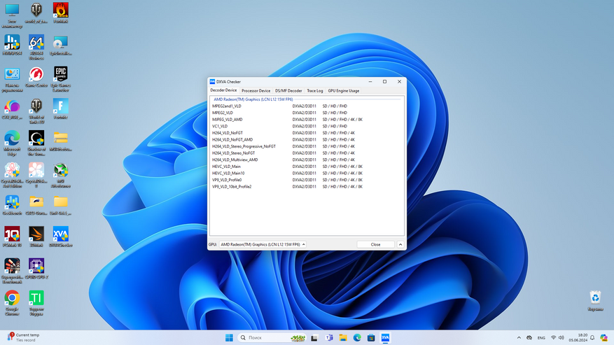 Теперь проверим мультимедийные возможности. Согласно DXVA Checker, поддерживается аппаратное декодирование H264 в разрешении до 4К, а также HEVC и VP9 в разрешении до 8К. Кодек AV1 не получил аппаратную поддержку и декодируется программным способом.
