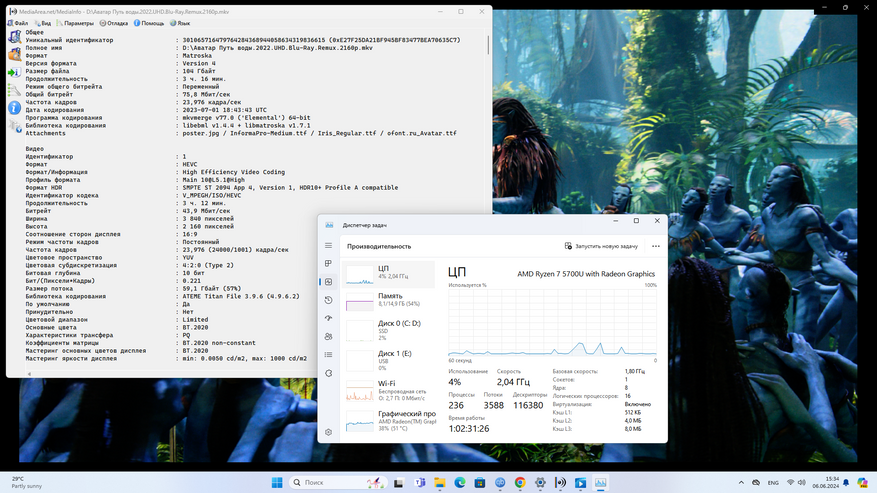 Для наглядности покажу нагрузку на компьютер при воспроизведении фильма в очень высоком качестве. Blu-Ray Remux фильма «Аватар: Путь воды» с общим битрейтом 75,8 Mbps (вес фильма более 100 GB) в 4К качестве с HDR10 нагружает процессор лишь на 4%, а графику на 38. При этом температура на чипе всего 51 градус.