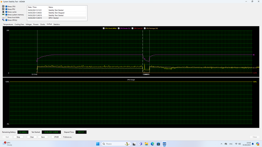 Минутка отдыха и еще 30 минут нагрузки, но уже с дополнительным использованием GPU. Здесь тепловой пакет удерживается на значении 25W, температура те же 86 градусов. При снятии нагрузки температура очень быстро возвращается к штатным 50 — 60 градусам.
