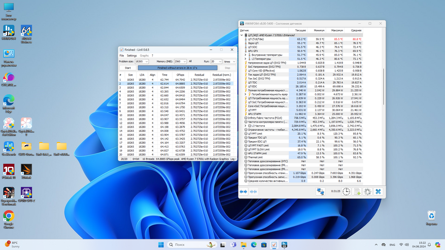 Более показателен стресс тест с использованием Linx. Этот пакет умеет заставить компьютер кипеть, поэтому следует следить за температурой. Здесь максимум достигал 85 градусов, тепловое дросселирование не зафиксировано. Тест пройден без ошибок за 26 минут 17 секунд.
