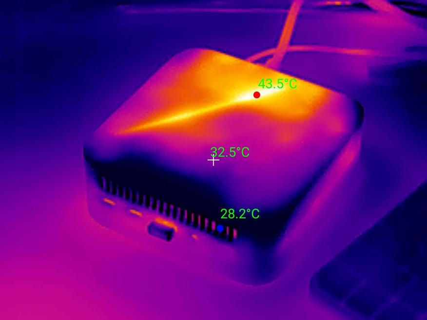 Благодаря небольшому тепловому пакету компьютер не требует громоздкого шумного охлаждения и не перегревается под нагрузкой. Термограмма наглядно показывает точку с наиболее высокой температурой (район процессора). Воздух забирается системой охлаждения через лицевую решетку, охлаждает внутреннее пространство и выдувается с противоположной стороны. Под высокой нагрузкой корпус нагревается до приемлемых 43 — 44 градусов, при стандартной нагрузке — до комнатной температуры. Еще раз акцентирую внимание, что активная система охлаждения здесь очень тихая. С легкой нагрузкой, вроде чтения интернет страниц, она даже не включается. Если работаете в ресурсоёмких приложениях может включиться на низких оборотах или средних оборотах, но ее едва слышно, как легкий шелест. На максималках (обычно это игры) слышно сильнее, но никаких завываний.