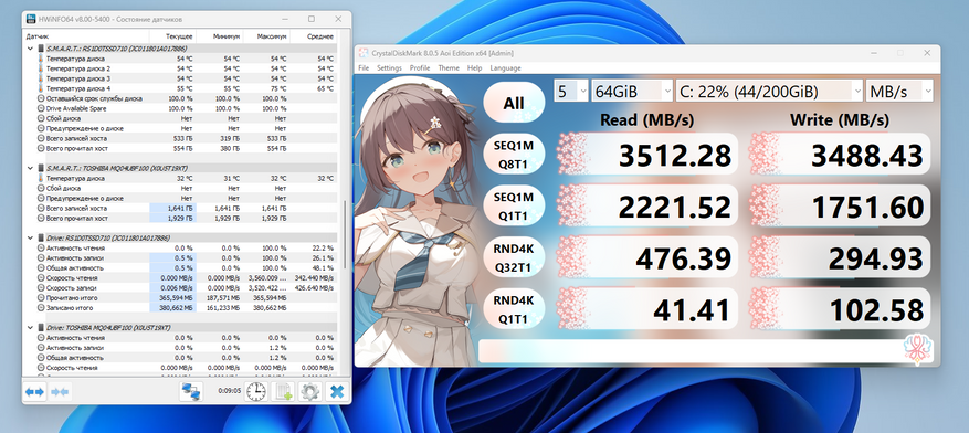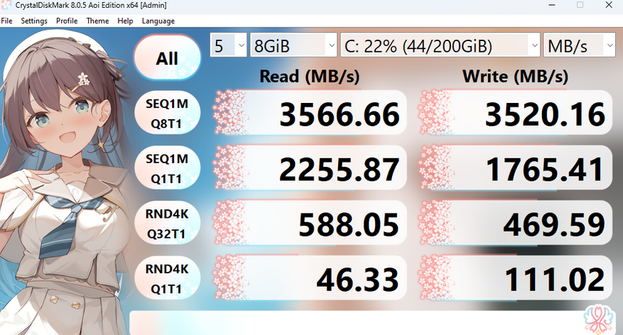 В итоге имеем неплохие для бюджетного SSD-диска скорости: 3566 MB/s на чтение и 3520 MB/s на запись.