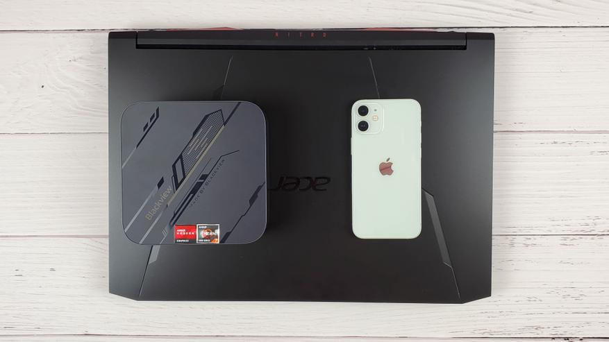 Чтобы лучше понимать габариты, посмотрите на компьютер вместе с Iphone 12 mini и 15,6″ ноутбуком Acer.