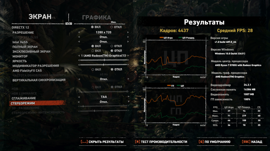 В более требовательной Shadow of Tomb Raider настройки графики пришлось опустить до низких со средним модификатором детализации, а разрешение до 1280 х 720. И даже в этом случае бенчмарк показал средние 28 FPS.