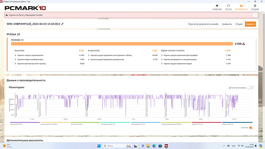 Далее еще несколько популярных тестов. Комбинированный тест PC Mark10 — 4938 баллов.