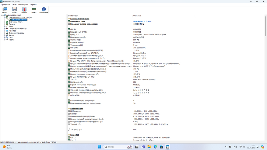 Как видим мощность ЦП здесь разблокирована: до 28W при длительной нагрузке и до 30W при кратковременной. Весьма неплохой и производительный 8 ядерный процессор, который работает с 16 потоками и в турбо режиме развивает скорость до 4,35 GHz. Рабочая температура — 100 градусов, техпроцесс 7 нм.