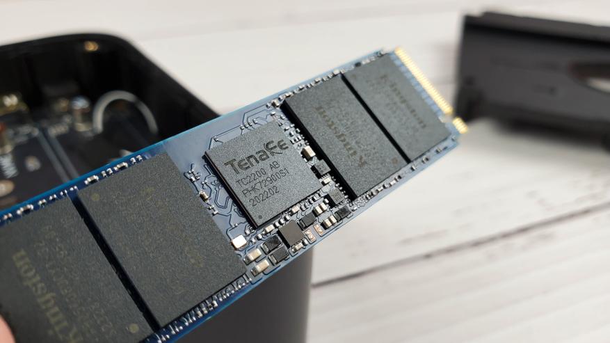 Наклейку я удалил, чтобы посмотреть на чипы. Да и охлаждение это улучшит, так как наклейка здесь самая обыкновенная. Контроллер Tenafe TC 2200 работает с SSD без DRAM, поддерживает интерфейс PCIe Gen4, NVMe 1.4 и максимальную производительность до 4,8 GB/s. Работает он в тандеме с памятью Kingston FB25608UCY1-32.