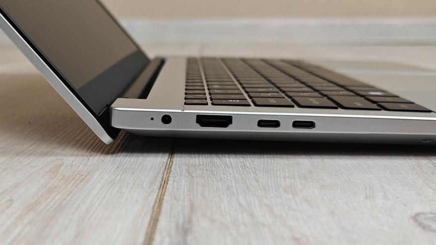 А с левой стороны нам доступно сразу два полнофункциональных USB-C разъема, которые можно использовать для самых разнообразных задач: вывод звука или изображения, подключение хабов и накопителей, а также для подзарядки самого ноутбука. Забавно, но классический разъем питания здесь все же оставили, хоть и не положили для него зарядку. Ну и конечно же есть HDMI для подключения к монитору или телевизору.