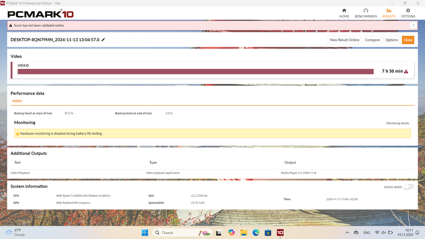 Также хочу добавить результаты тестирования аккумулятора при помощи программы PC Mark. В этом случае я выставил яркость экрана на 60%, что является для меня комфортным значением для работы в помещении с легким фоновым освещением. В режиме Modern Office ноутбук проработал 8 часов 10 минут. Т. е если не нагружать его тяжелыми задачами и выставить средний уровень яркости, то заряда вполне хватает на полный рабочий день.