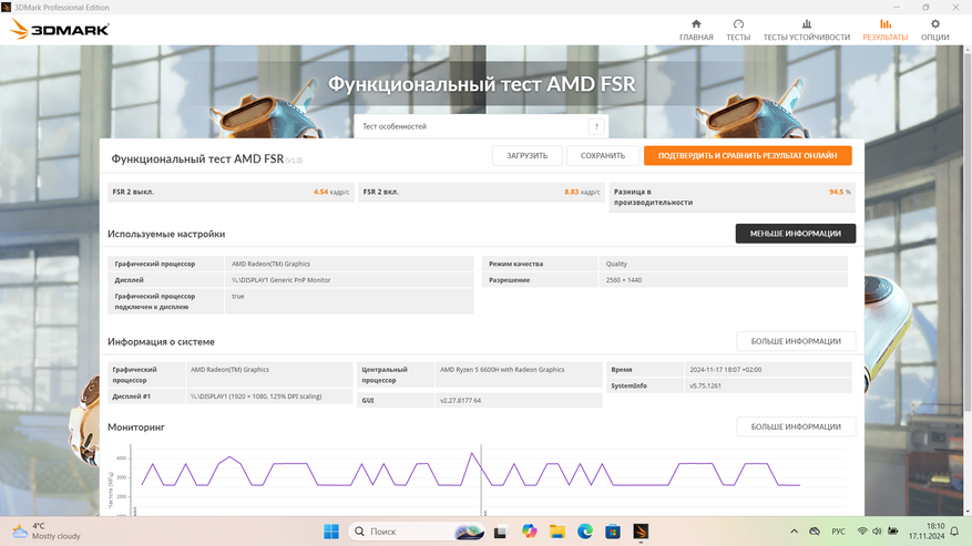 Также был проверен режим AMD FSR, который поддерживается графическим ускорителем. При его активации прирост производительности составляет 94,5%.