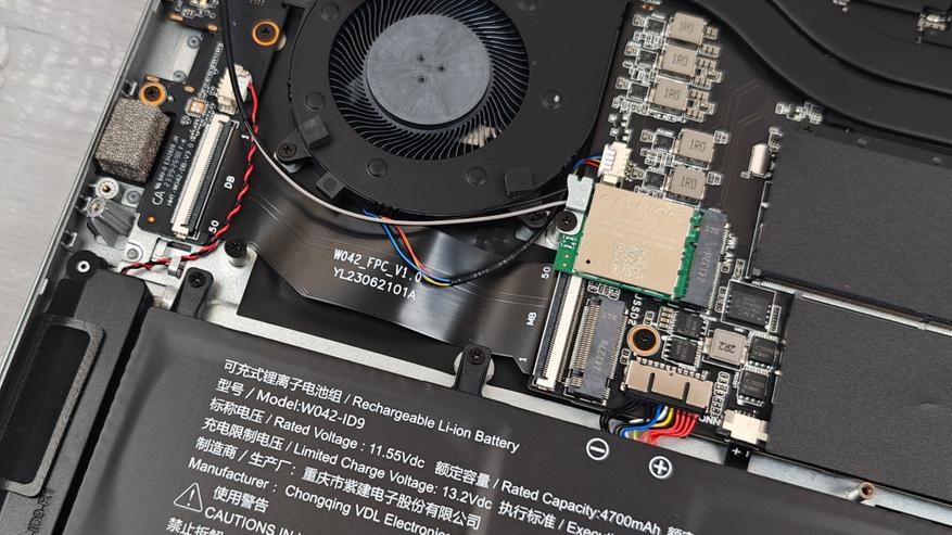 Компоновка ноутбука максимально эффективная, неиспользуемого пространства внутри практически нет. Двойная система охлаждения с общими трубками выглядит обещающе, общая площадь меди достаточно серьезная. Оперативка по центру закрыта антистатической пленкой, правее можно заметить SSD формата 2280, а в нижней части расположился длинный аккумулятор, состоящий из 3 элементов.