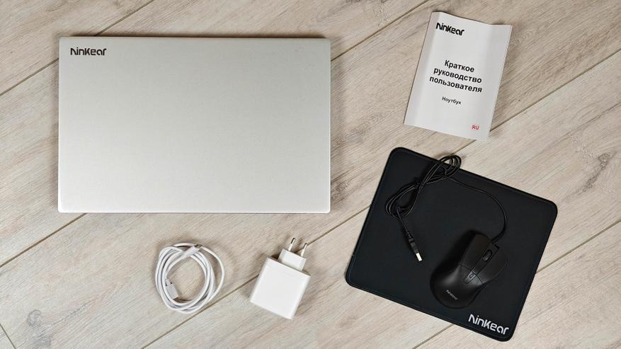 В комплект к ноутбуку кладут: зарядное устройство, кабель, краткое руководство пользователя на русском языке и недорогие подарки (проводная мышка и коврик).