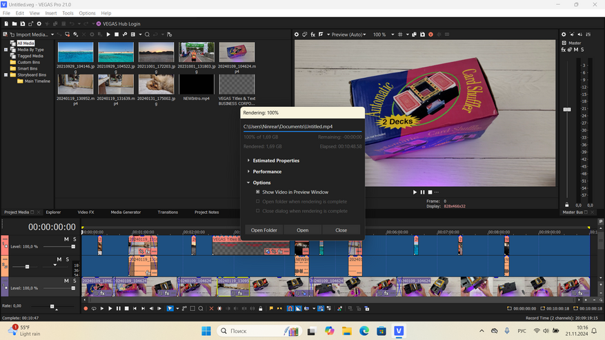 Теперь что касается видео рендеринга. Пару лет назад я создал специальный проект, который тестирую на разных ноутбуках и сравниваю время, потраченную на обработку. Видео рендериться в 4К разрешении в MP4 HEVC. Ноутбук, с которым я сегодня все время сравниваю (Ninkear N16 Pro 2024 на базе Core i7 13620H) справился с ним за 14 минут 20 секунд. Как думаете, этот ноутбук быстрее? Значительно! Ему для рендеринга потребовалось 10 минут 48 секунд! Т. е Ryzen 5 6600H лучше, чем Core i7 13620H не только в играх, но и рабочих процессах, вроде монтажа.