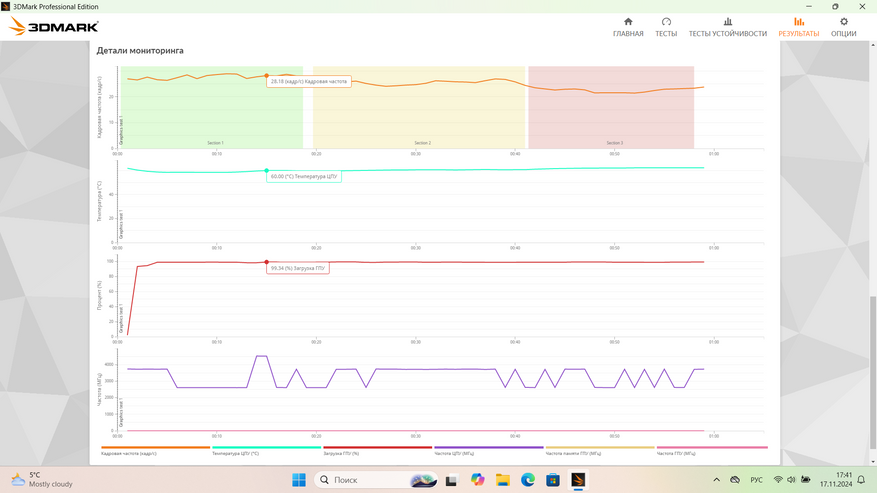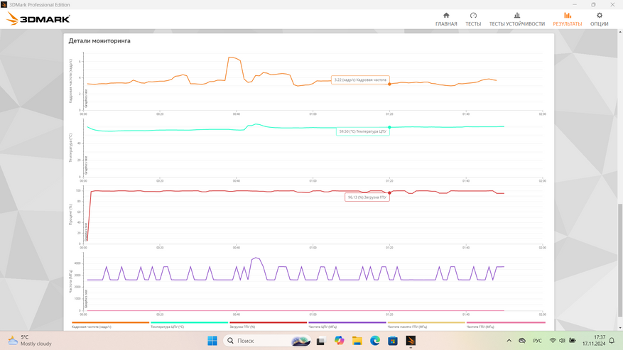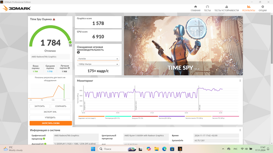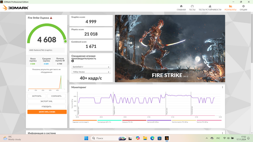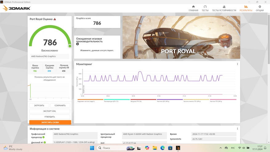 Теперь перейдем к графическим тестам и самым показательным в этом плане является бенчмарк 3D Mark. В Fire Strike Ninkear A15 Pro набрал 4608 баллов и если снова сравнить с N16 Pro на базе Core i7 13620H, который набирает 3819 баллов, то здесь у сабжа значительный перевес.